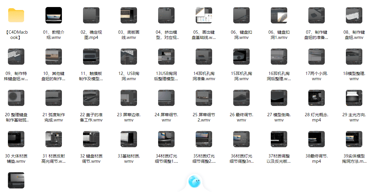 课程内容从前期建模入手,先讲解视图确定、底板画线、模型挤出等基础步骤,再逐步深入到键盘结构、USB 接口、耳机孔等细节部分的制作与整理。通过这一流程,学习者不仅能掌握笔记本模型的搭建方法,也能理解产品类模型中常见孔位与结构的处理技巧。