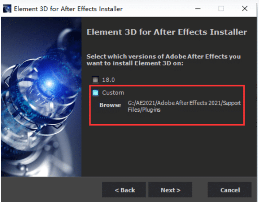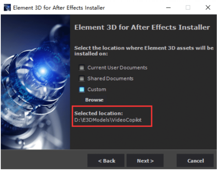ElementInstaller_2.2.2.2160.exe文件并双击运行。在安装界面中,选择Custom(自定义安装)并点击Browse,将安装路径指定到你的 AE 安装目录下的Support Files\Plug-ins文件夹。随后进入模型资源安装环节,可选择Current User Documents(当前用户文档)、Shared Documents(共享文档)或Custom(自定义路径),推荐自定义路径并选择空间充足的盘符,示例路径:D:\E3DModels \VideoCopilot,设置完成后继续安装。