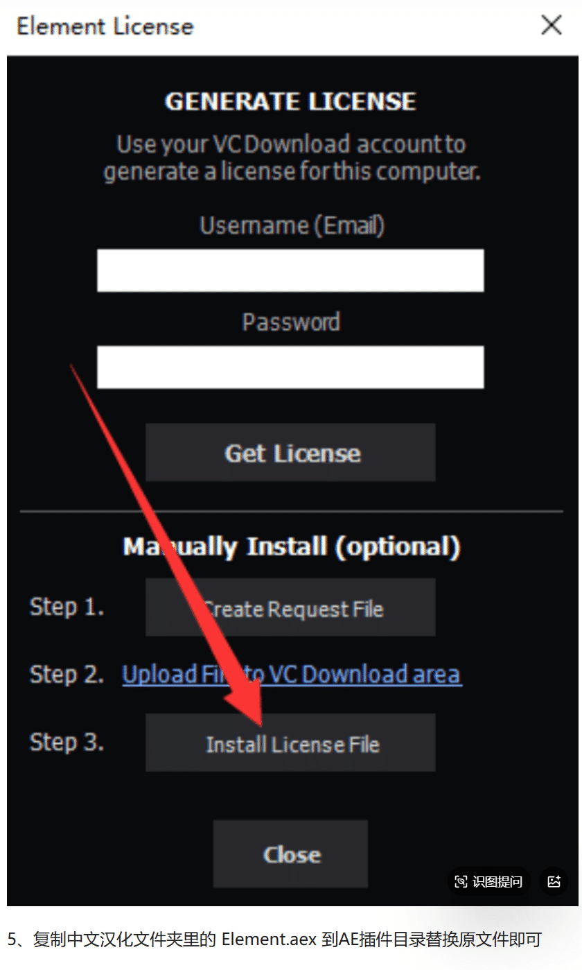 Element.aex文件并复制。导航至 AE 安装目录下的Plug-ins\Videocopilot\文件夹,将复制的文件粘贴至此,替换掉原有文件。 - 激活插件许可