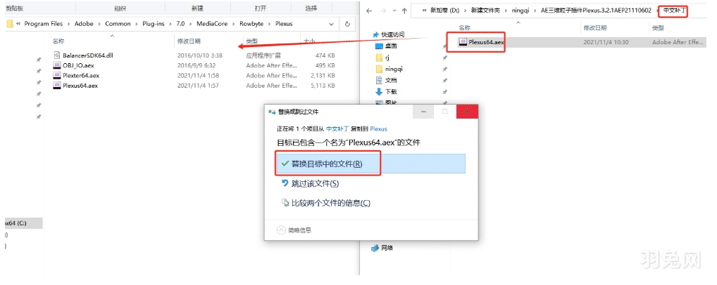 Plexus64.aex文件。导航至路径C:\Program Files\Adobe\Common\Plug-ins\7.0\MediaCore\Rowbyte\Plexus,将复制的补丁文件粘贴至此,替换原有文件;