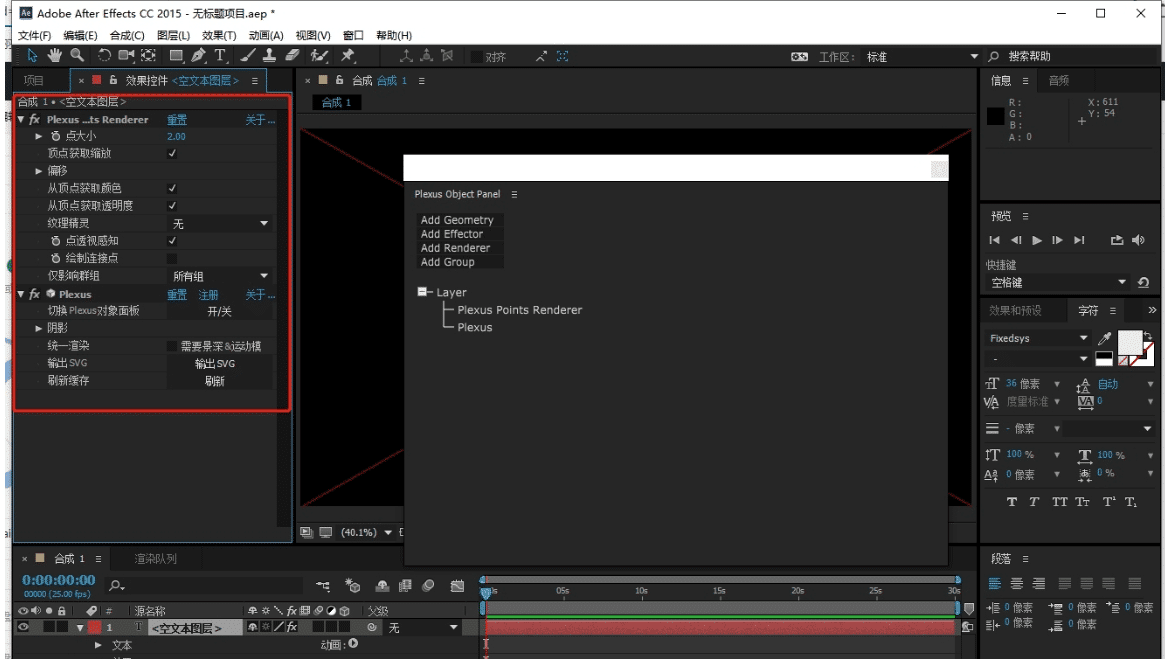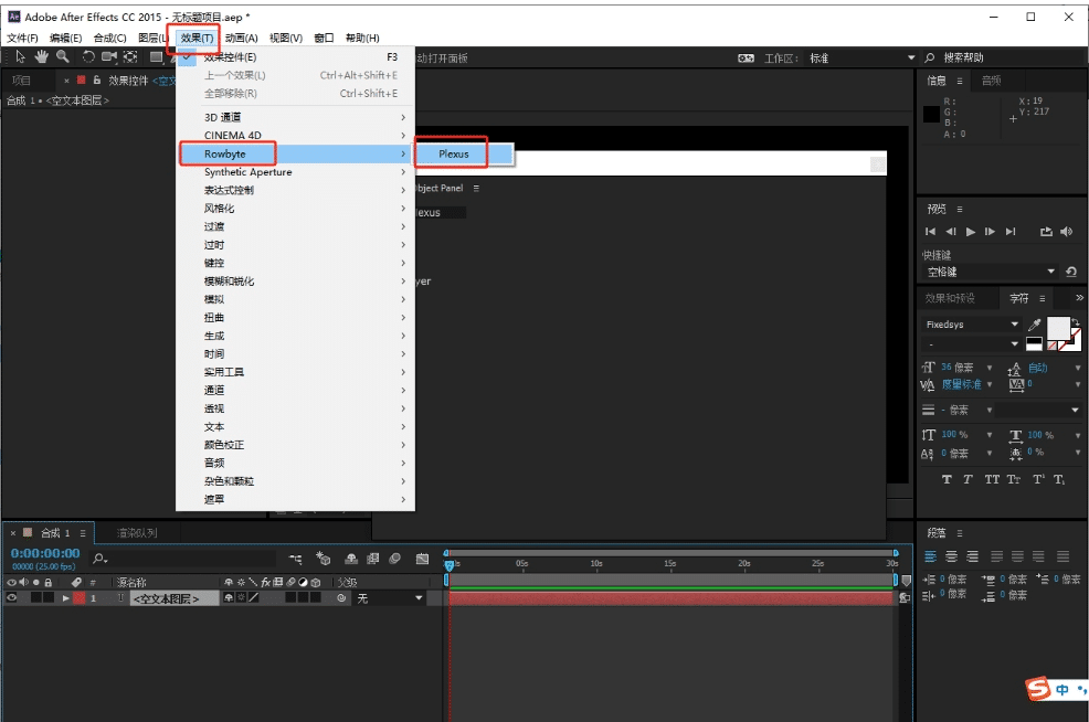 - 启动插件:打开 AE 软件,新建合成与图层,点击顶部菜单栏【效果】-【Rowbyte】-【Plexus】,即可调出插件面板;