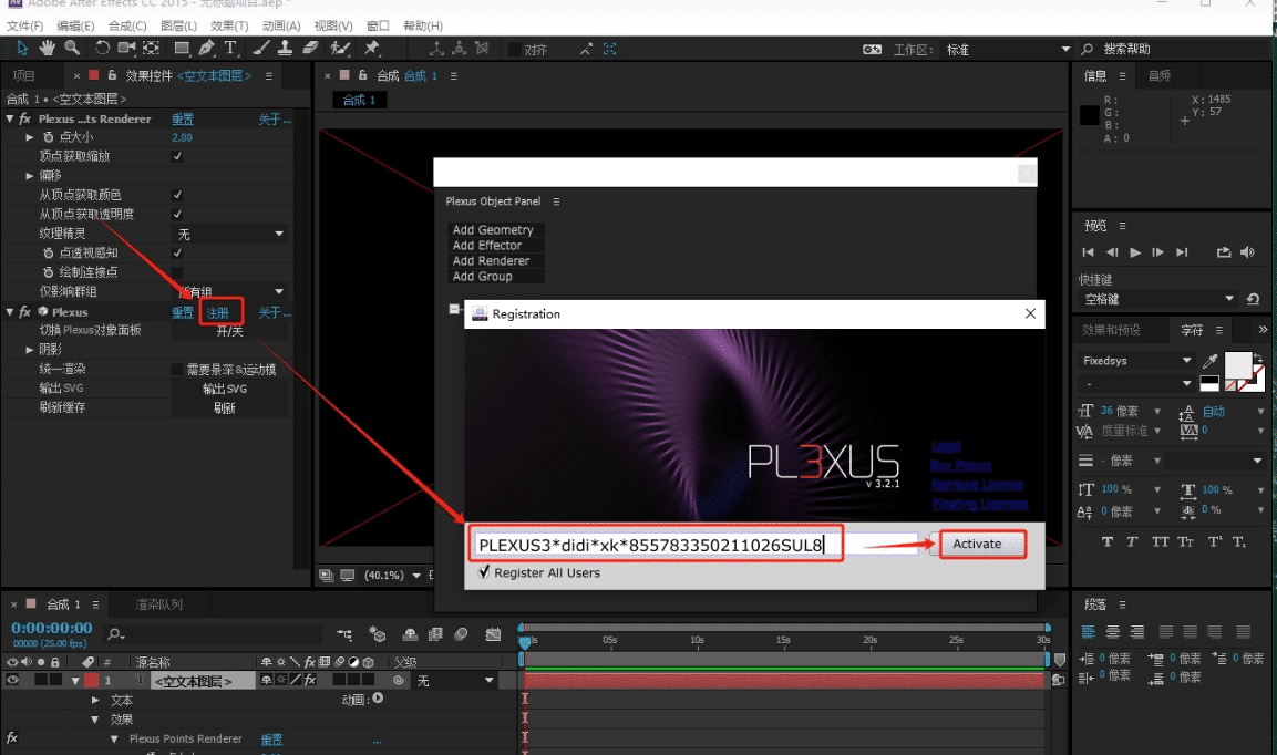 PLEXUS3*didi*xk*855783350211026SUL8,点击Activate。当界面显示Plexus3 registered (system level)时,即为注册成功,可正常使用全部功能。