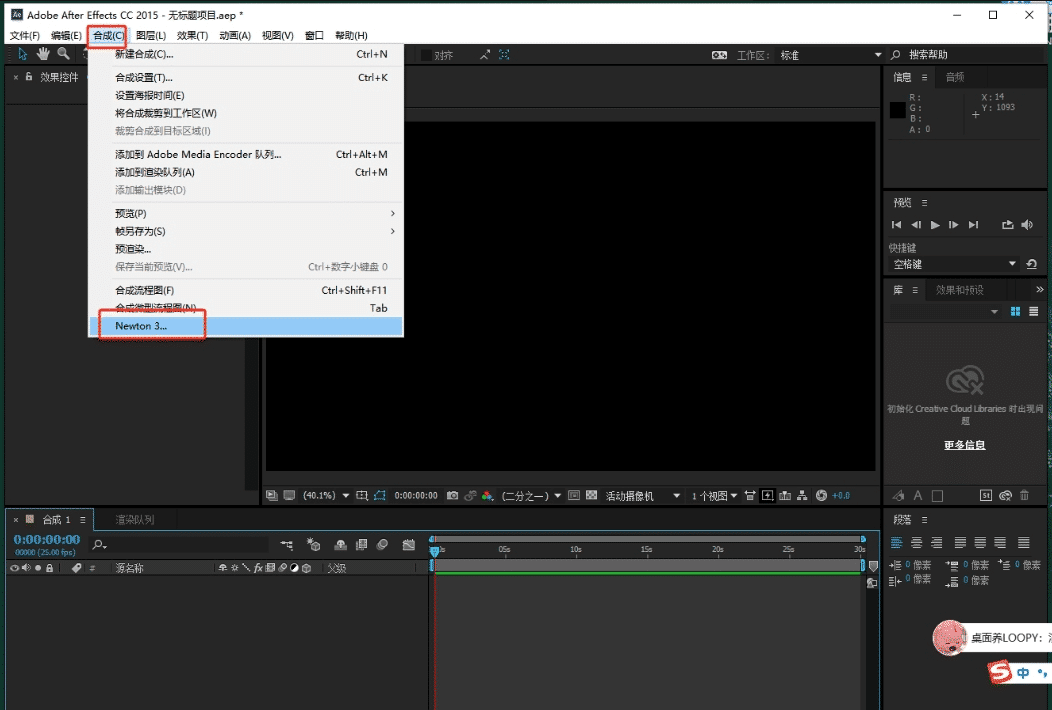 - 启动插件:打开 AE 软件,新建合成与图层,点击顶部菜单栏【合成】,在下拉菜单中选择