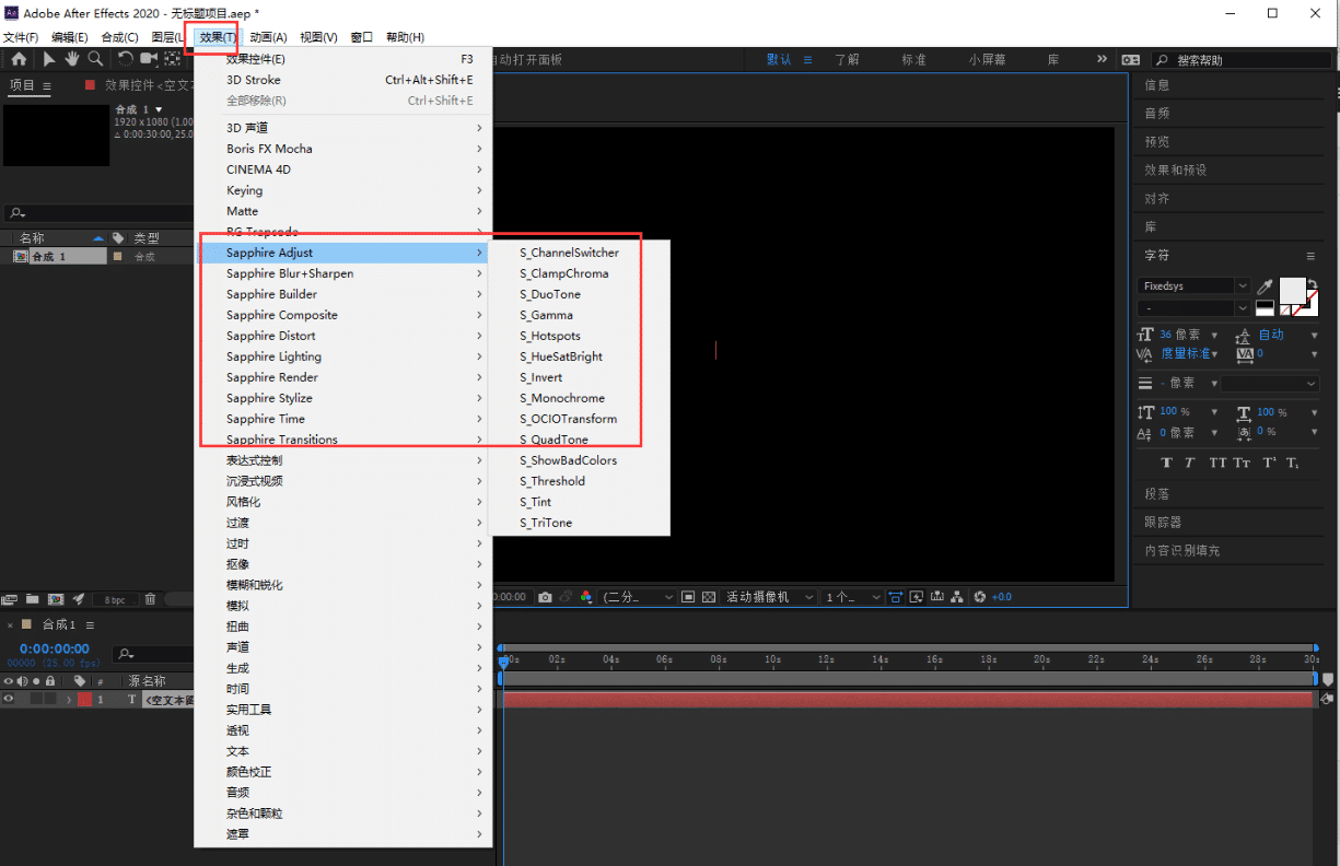 - 启动插件使用:打开 AE 或 PR 软件,新建合成 / 序列,点击顶部菜单栏【效果】,在下拉列表中找到 “Sapphire” 插件组,选择对应特效即可调用。