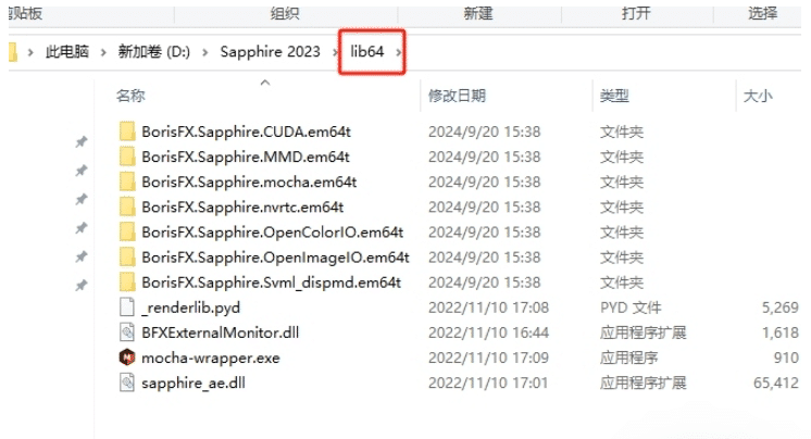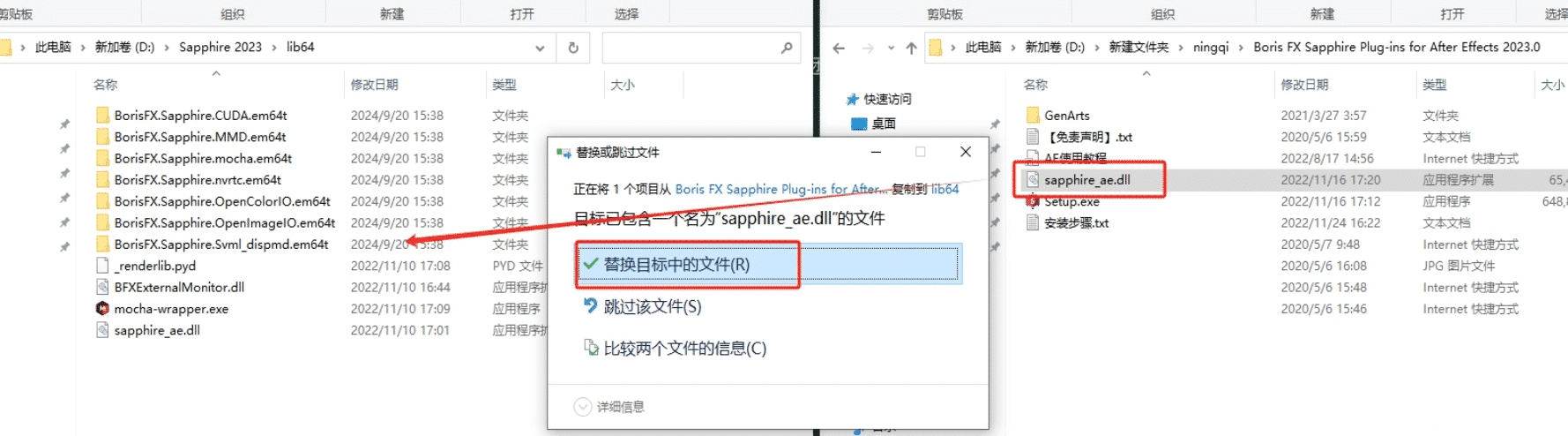 sapphire_ae.dll文件。导航至步骤 5 设置的安装目录下的lib64文件夹(示例路径:D:\Sapphire 2023\lib64),将复制的文件粘贴至此,替换原有文件;