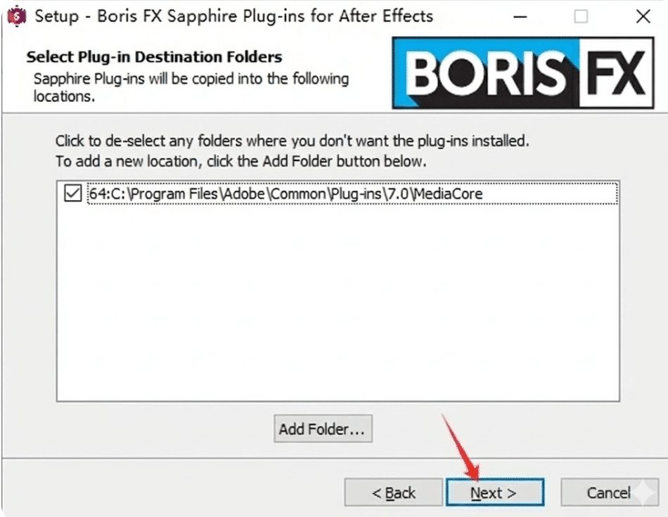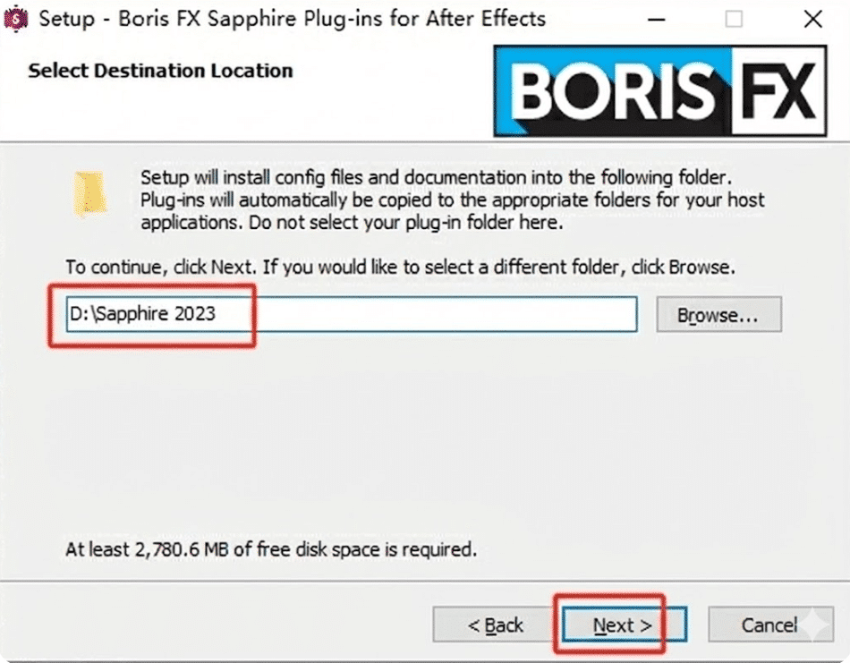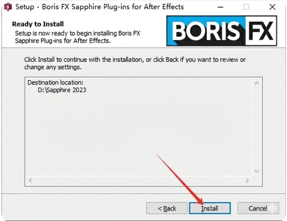 - 设置软件安装目录:选择 Boris FX Sapphire 的安装路径(建议默认或自定义无中文、无特殊符号的路径,如