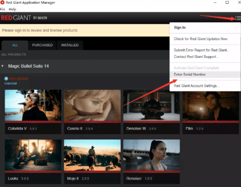 Activate激活按钮。弹出Red Giant Application Manager窗口时,无需登录,直接点击Cancel。随后点击窗口右上角的按钮,选择Enter Serial Number;