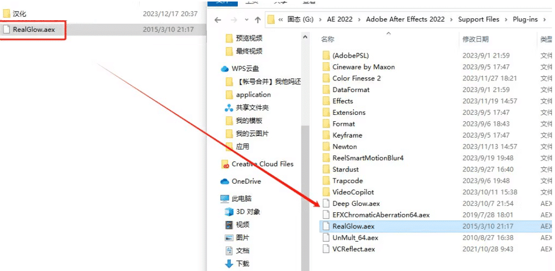 RealGlow.aex汉化文件复制,粘贴到Plug-ins文件夹中,无需替换其他文件,安装即完成。