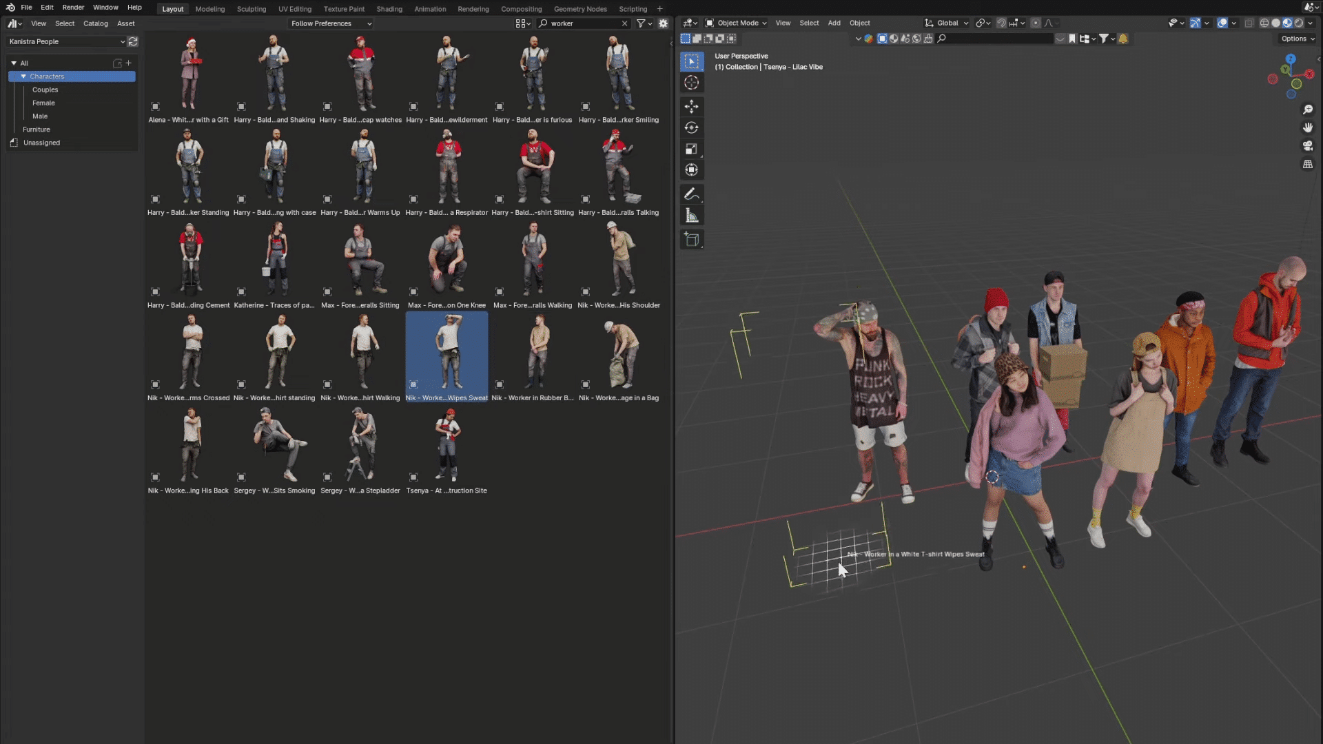 - 即拿即用高效融入:角色模型经过标准化处理,导入 Blender 后可快速适配场景光影与材质环境,无需复杂的调整或优化,显著减少场景人物布置的时间成本;