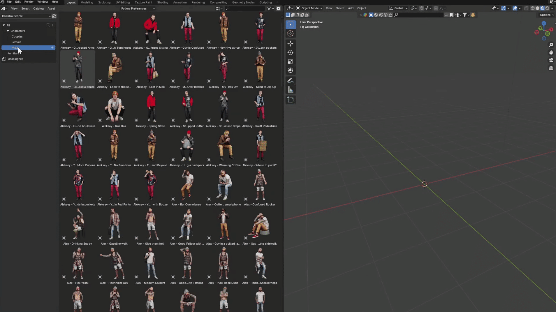 Kanistra People Asset Library 是一款专为 Blender 创作者打造的高品质人物角色 3D 模型资产库,核心定位是为建筑可视化、概念艺术、视觉开发等多元创作场景,提供即拿即用的逼真人物角色资源。资产库内的所有角色模型均基于专业摄影测量扫描技术制作,自带多种预设姿势,无需手动建模或调整姿态,可快速融入各类场景,大幅缩短场景人物布置周期,提升作品的视觉真实感与创作效率。