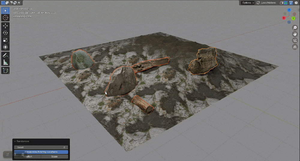 重排与随机化 (Rearrange & Randomize): 在指定轴向上随机化所选物体的位置,或打乱现有位置。
